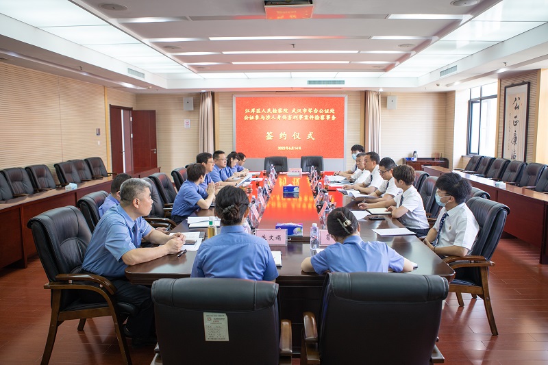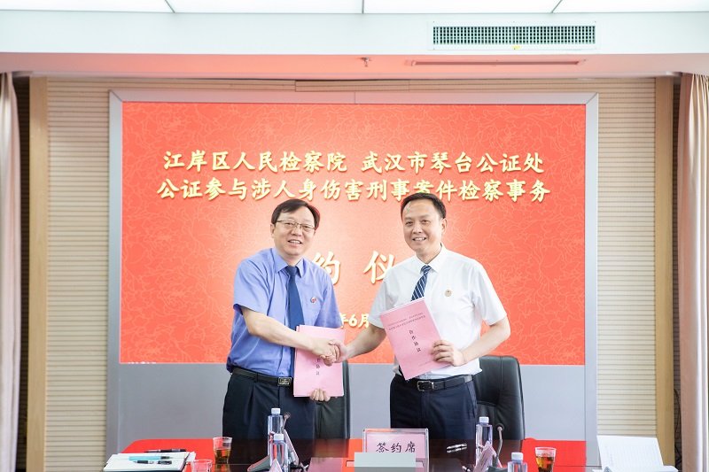 本网讯(通讯员 葛琴)6月14日,武汉市江岸区人民检察院与武汉市琴台公证处签署《公证参与涉人身伤害刑事案件检察事务合作协议》,正式建立起湖北省首个“公证参与刑事案件调解及赔偿金提存工作机制”。该院党组书记、检察长杨屹东、武汉市琴台公证处主任周凡等参加合作机制签约仪式。