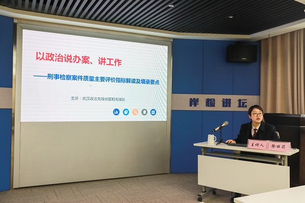 本网讯(通讯员 张晨)为深入学习贯彻习近平法治思想,落实全国检察长会议精神,推进讲政治与抓业务有机统一,落实院党组一季度“学习季”的工作要求,近日,江岸区人民检察院召开“以政治说办案、讲工作——政法先锋队授课研讨”活动。徐丽莉先锋队队长徐丽莉就刑事检察案件质量主要评价指标进行解读。该院党组副书记、副检察长何伟及刑检部门干警参加此次活动。