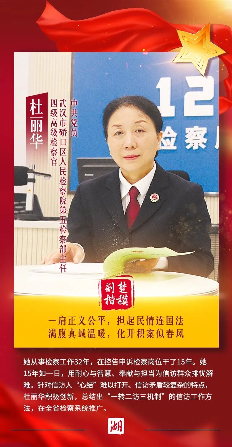 本网讯(通讯员 硚检宣)经湖北全省各地各部门层层推荐,省委宣传部组织评审,12月20日,湖北日报揭晓了9月至10月“荆楚楷模”上榜人物名单。硚口区检察院第五检察部主任杜丽华光荣上榜!