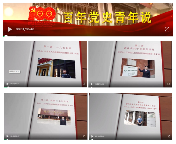 该院还开展“百年党史青年说 寻访江岸红色地标”活动四期,组织青年干警通过寻访江岸红色地标的形式讲述有关武汉红色革命历史故事,并拍摄成宣传视频,以上四期视频皆入选“学习强国”武汉学习平台微慕课,其中《百年党史青年说之武汉中央机关旧址》获得江岸区“百年党史·红色传承”优秀党课、《百年党史青年说之八七会议会址纪念馆》讲解员汪阳获得江岸区“红色故事汇”大赛优秀讲解员称号,该系列活动还荣获武汉市人民检察院表彰。