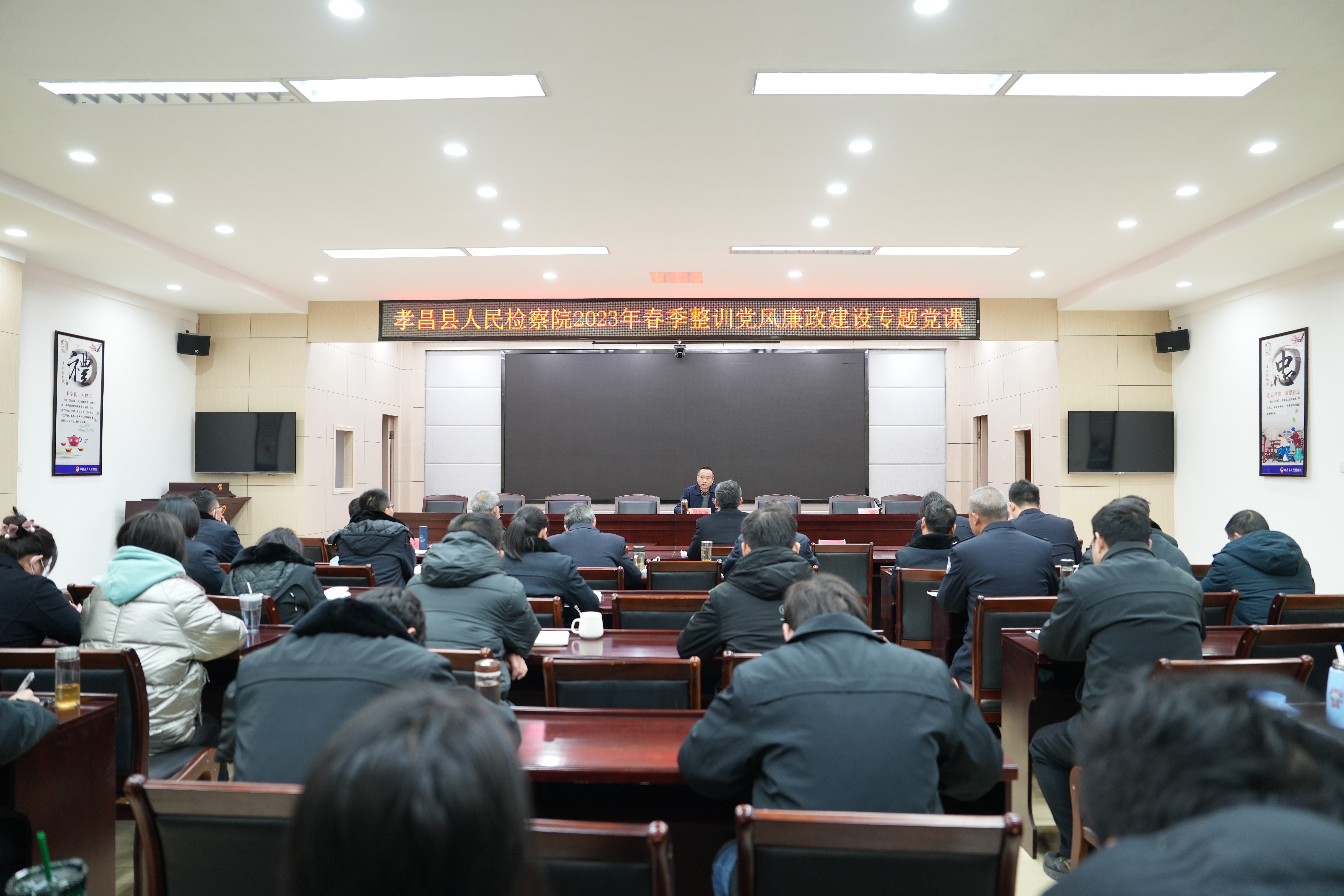 为深入学习贯彻党的二十大精神,进一步加强纪律作风建设,2月2日上午,孝昌县检察院2023年春季整训党风廉政建设专题党课开讲了。院党组书记、检察长陈鹏出席会议并讲话,党组成员、副检察长汪明华主持会议,全院干警参加了会议。
